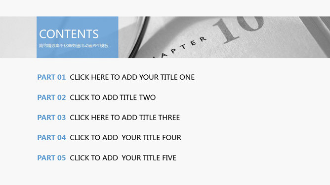 极简大气动态商务PPT模板。一份大方稳重的商务风格幻灯片模板,蓝灰黑配色,超简约风格,动态演示效果。