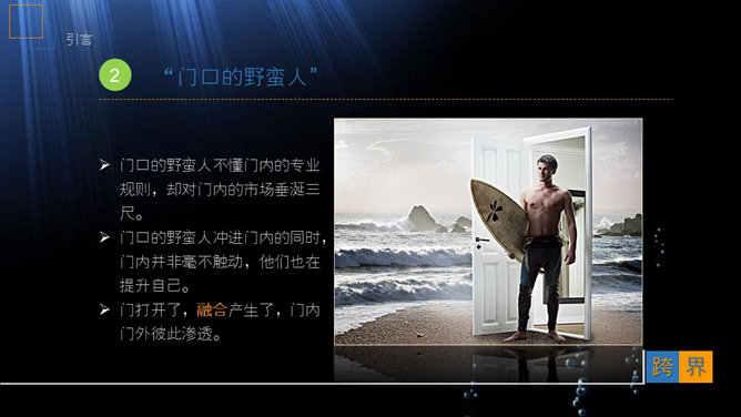 互联网与传统行业《跨界》读书笔记PPT。互联网带来的跨界浪潮正以前所未有的趋势颠覆传统行业,互联网作为一个产业将会消失,因为所有产业都将会互联网化,互联网与传统行业融合趋势正在形成。