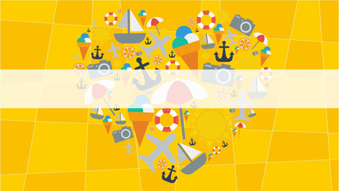一份旅游休闲主题的卡通PPT背景图片,以冰淇淋、帆船、照相机、飞机等为背景,适合制作旅游休闲类主题的幻灯片。