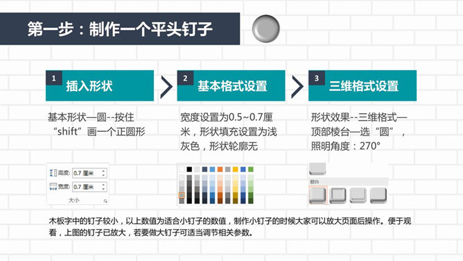 制作木板效果数字PPT教程。步骤:1、插入-形状-选择矩形-画一个长条状矩形。2、设置形状格式-填充-选择图片或为例填充-选“深色木质”纹理。3、设置形状格式效果,对效果中的三维格式、三维旋转和阴影进行设置。然后制作钉子,步骤:1、制作一个平头钉子……
