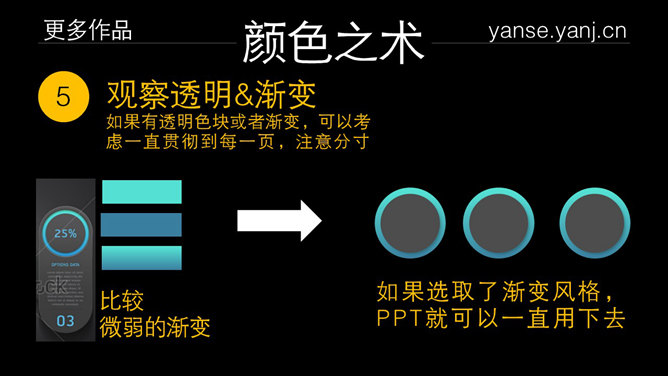 可以从其他PPT作品借鉴哪些设计元素?可以从颜色、质感、文字、图片、图形、版式几个方面借鉴。颜色之术:看背景、第一感觉就是主色调,不明显的是辅助色,明显和比较亮的就是强调色。图形之术:从线条、色块、图标几个方面……