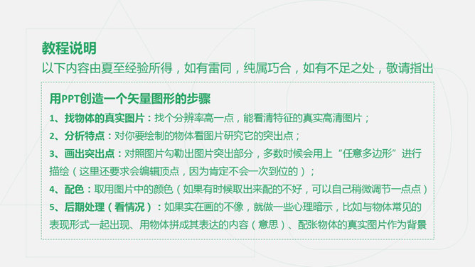 用PPT参照实物绘制矢量图形。用PPT创造一个矢量图形的步骤:1、找物体的真实图片:找个分辨率高一点,能看清特征的真实高清图片;2、分析特点:对你要绘制的物体看图片研究它的突出点;3、画出突出点:对照图片勾勒出图片突出部分,多数时候会用上“任意多边形”进行描绘(这里还要求会编辑顶点,因为肯定不会一次到位的);4、配色:取用图片中的颜色(如果有时候取出来配的不好,可以自己稍微调节一点点)5、后期处理(看情况):如果实在画的不像,就做一些心理暗示,比如与物体常见的表现形式一起出现、用物体拼成其表达的内容(意思)、配张物体的真实图片作为背景。