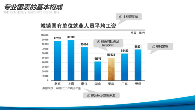 PPT图表构成基本要素。包括:1、主标题明确。2、布局紧凑。3、脚注标示数据来源。4、颜色对比强烈标示突出。