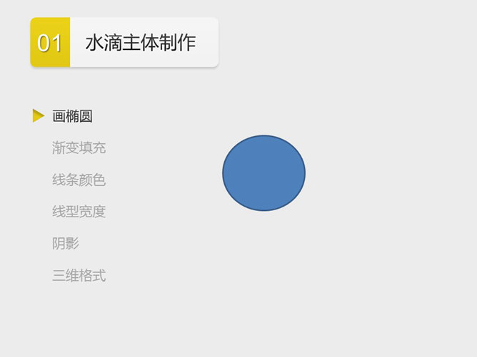 PPT绘制逼真水滴教程。步骤:1、画一个椭圆。2、给这个椭圆按照教程渐变填充。3、设置线条颜色。4、设置线型宽度,随形状大小而定。5、调节阴影。6、设置材质和照明三维格式。再制作水滴高光部分。组合完成。
