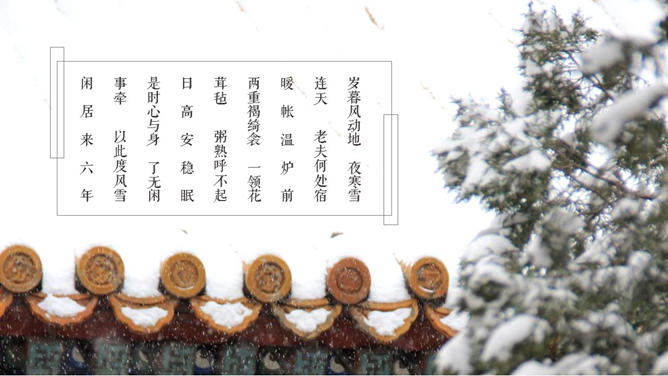 故宫雪景风景欣赏PPT作品。大雪后的故宫风景照片配合古典文字及字体排版,很有历史厚重感和经典隽永的美。建议安装字体:方正清刻本悦宋简体。