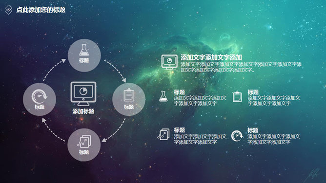 科技感星空背景动态PPT模板。一份精美时尚的幻灯片模板,以梦幻宇宙星空图片为背景,白色半透明图形元素及文字,简约时尚科技感,动态演示效果。建议安装字体:Billboard、张海山锐谐体。