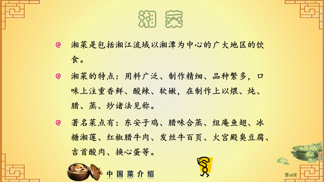 中国菜系介绍PPT。内容包括:菜系简介、烹饪历史、八大菜系、其他菜系、形成原因、制作工艺。使用字体:华文行楷、华文琥珀、华文行楷。