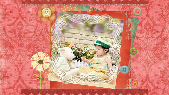 宝贝婴儿儿童相册PPT模板。红色花纹布纹纹理背景,可爱爱心花朵蝴蝶等装饰,建议安装字体:汉仪丫丫体简、Edwardian Script ITC。