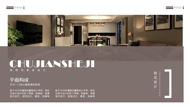 室内装潢设计装修主题PPT模板。一套室内家装设计装潢装修主题的幻灯片模板,以图文排版为主题,利于效果图展示。