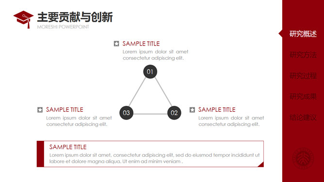 红色侧边导航论文答辩PPT模板。一套通用毕业设计论文答辩pptt模板,热情暗红色主色调,侧边栏目录导航,动态播放演示,使用字体:华文细黑。