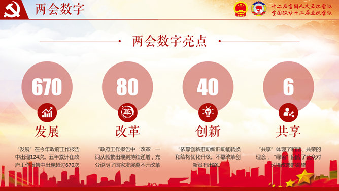 全国两会解读聚焦两会PPT模板。一套关于全国两会的幻灯片模板,大气红色党政风设计风格,适合两会解读、两会政策宣传介绍。建议安装字体:禹卫书法行书简体、方正清刻本悦宋简体。