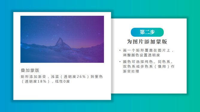 四步轻松打造唯美IOS风渐变PPT背景。第一步:寻找合适的图片。何为合适?符合PPT的主题性质,符合行业性质,考虑使用场景。第二步:为图片添加蒙版。画一个矩形覆盖在图片上,调整颜色设置透明度。颜色可选择纯色、同色系、双色系或多色系(慎用)作渐变处理。第三步:添加形状和主体文字。第四步:添加元素美化。