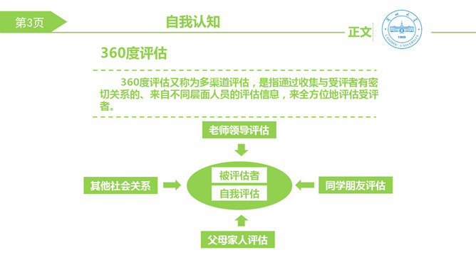 一份内容丰富全面的大学生职业生涯规划PPT模板,动态播放效果,绿色主色调,包括自我认知、职业认知、规划设计。