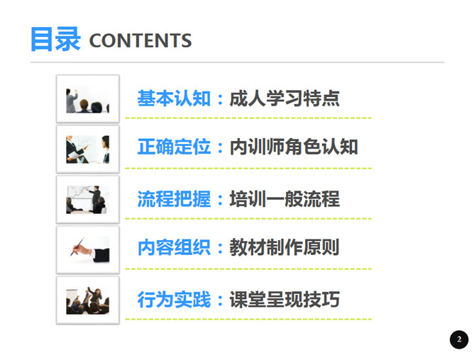 这是一份非常专业的内训师培训PPT,共63页,动态切换效果,设计非常专业,内容也很丰富,主要包括:成人学习特点、内训师角色认知、培训一般流程、教材制作原则、课堂呈现技巧等内容。