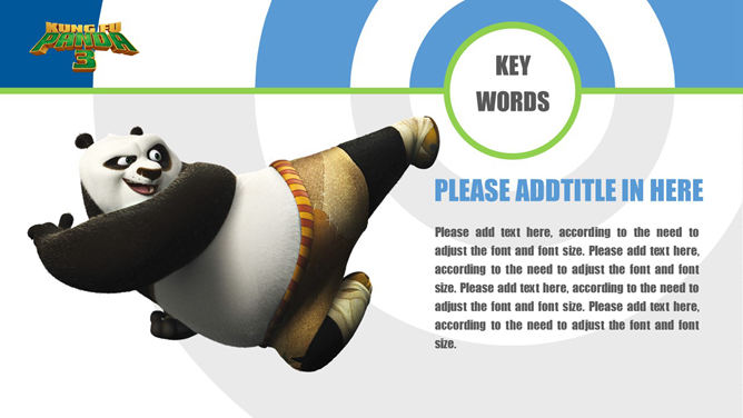 一份优秀的《功夫熊猫3》主题PPT作品,时尚杂志海报设计风格,炫酷动态播放效果,附带背景音乐。