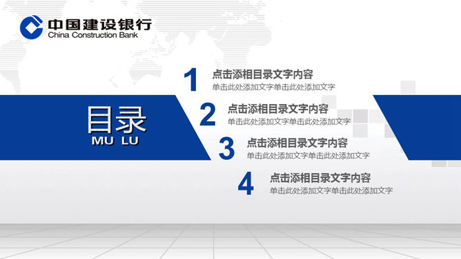 一份中国建设银行专用的PPT模板,共42页,包含了非常多的内页类型,炫酷的动态演示效果,适合建行工作人员工作汇报总结、业务数据分析、产品推广等用途。使用字体:方正兰亭大黑_GBK、方正隶二简体、方正大黑简体。