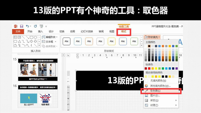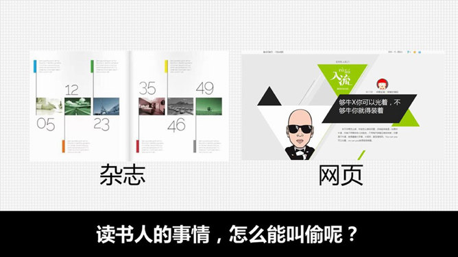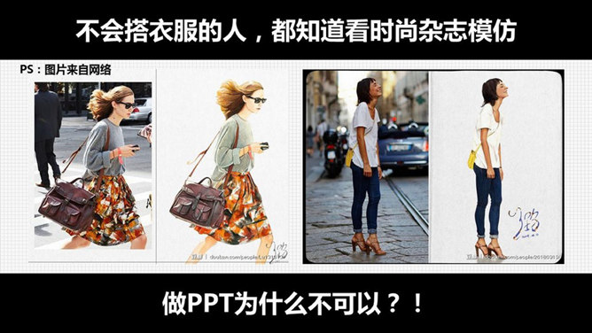 PPT逼格提升大法之配色篇。如图,让我们来感受一下配色的重要性,明白了吗。让我们从最简单的做起。第一招,黑白加一种彩色,选择一个你最喜欢的颜色,配上黑和白,不会让你失望,简洁大气,大面积使用色块更加精彩。想要炫酷感就加上一个黑白的应景底图,如果你学会了调整颜色的透明度的话,那PPT简直就非常非常饱满了。第二招,天生没有审美,那就去模仿,当你看到一张顺眼的图片,就把它的颜色偷过来……