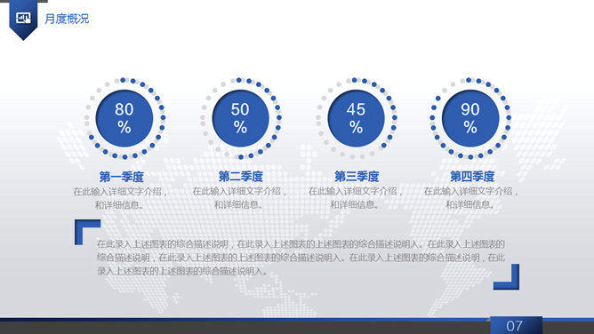 大气动态商务工作报告PPT模板。一套大气商务风工作总结报告幻灯片模板,浅灰世界地图背景,蓝色主色调,共40页,页面类型丰富实用,动态播放效果,稍作修改可用于公司介绍、产品宣传等其他用途。