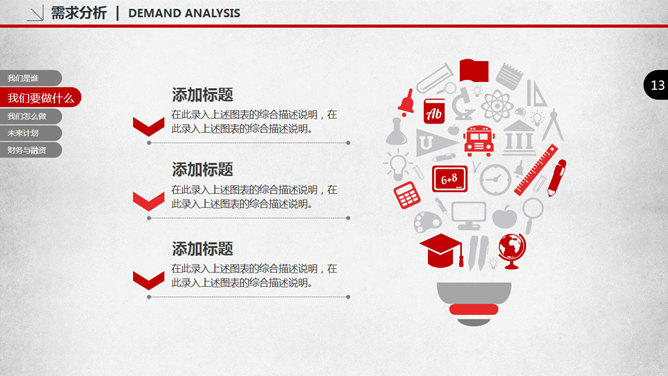 创业商业融资计划书PPT模板。一套大气实用创业商业融资计划书幻灯片模板,页面丰富框架结构完整,包括我们是谁、我们要做什么、我们怎么做、未来发展、财务与融资。