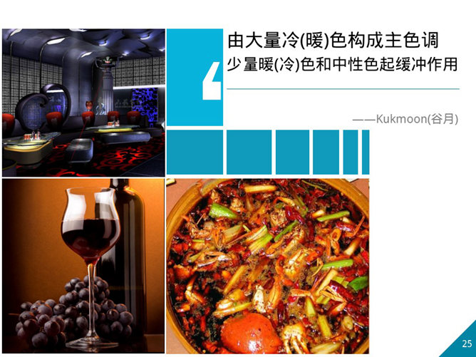 色彩调和PPT配色的基本技巧。色彩用于表达可吸引眼球、渲染情境、表达观点。作用于人能让人活跃,让人沉静。色彩正确搭配能营造优雅的气氛,描摹多彩的青春。色彩只要有效运用就会成为最给力的设计元素。